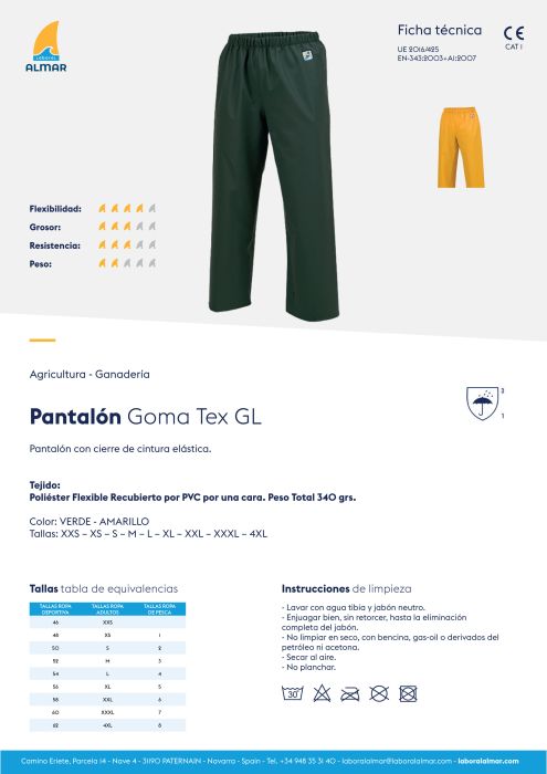 Pantalón de Aguna modelo ALMAR Goma Tex GL en talla L (54). Color Verde.
