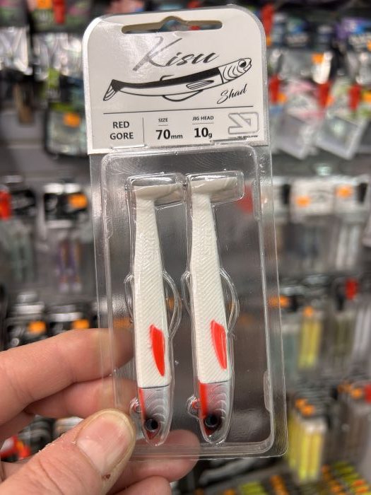 Blister con 2 Señuelos para spinning modelo YKR KISU SHAD de 10 gramos y 70mm. Color Red Gore. Este blister viene con 2 señuelos completamente montados.