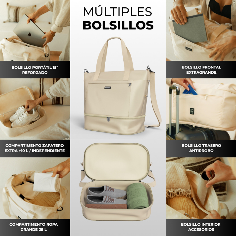 Múltiples bolsillos: ordenador portátil 15”, zapatero independiente y múltiples compartimentos de distintos tamaños