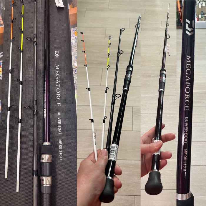 Caña de 2 +2 tramos DAIWA MEGAFORCE QUIVER BOAT modelo de 2,10 metros y acción 50-250 gramos especial embarcación. Fabricada en carbono, dispone de anillas OAL. Esta caña dispone de 2 puntales intercambiables de vidrio macizo: la puntera amarilla tiene una acción de 50-100 gramos y la puntera naranja tiene una acción de 125-250 gramos. Caña resistente diseñada para la pesca profunda que requiere una gran sensibilidad. Se sugiere utilizarlo con un carrete tamaño 300 a 5000.