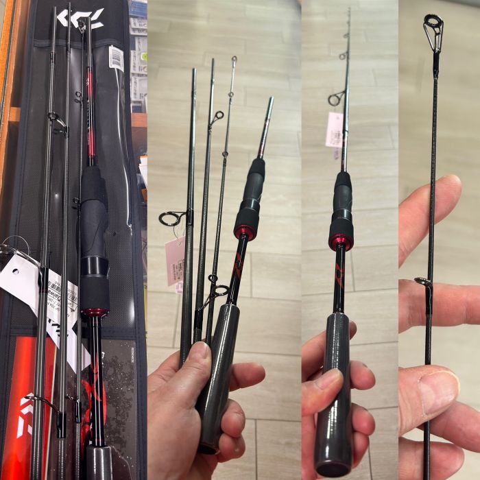 Caña de 4 tramos DAIWA NINJA SP 704 MHFSE CF modelo de 2,13 metros y acción 7-28 gramos especial para viaje por su plegado de 59cm.Peso 118 gramos. Ideal para la pesca de Spinning con señuelos.