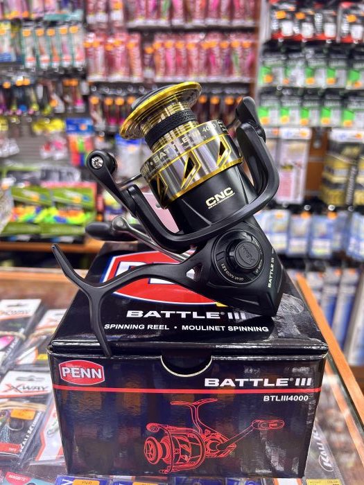 Carrete PENN BATTLE III 4000 con 5 Rodamientos sellados de Acero Inoxidable, con ratio 6.2 y 347 gramos de peso. Cuerpo y tapa totalmente metálicos. Tecnología CNCgear. Se recomienda uso de nyon del 0,31mm / 200 metros y uso de trenzado 0,25mm/330metros.