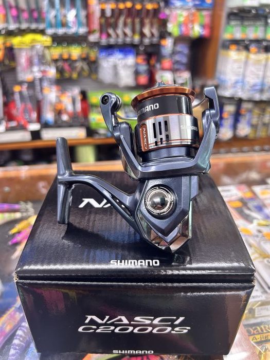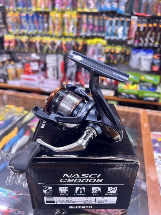 Carrete SHIMANO NASCI C2000S de 5 + 1  Rodamientos y 3 Kg de Potencia de Frenado. Pesa 210 gramos y tiene un ratio de 5.0 . Se recomienda nylon de 0,16 mm/ 105 metros. Tamaño ideal para spinning ligero y pesca eging .