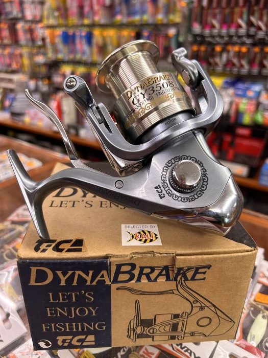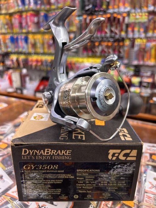 Carrete TICA DYNABRAKE modelo GY3508 . Dispone de 3 Rodamientos inoxidable, un ratio de 5.2 y un peso de 405 gramos. Se recomienda nylon del 0,32mm / 160 metros. Sistema de palanca ON/OFF para gestionar el antiretroceso.