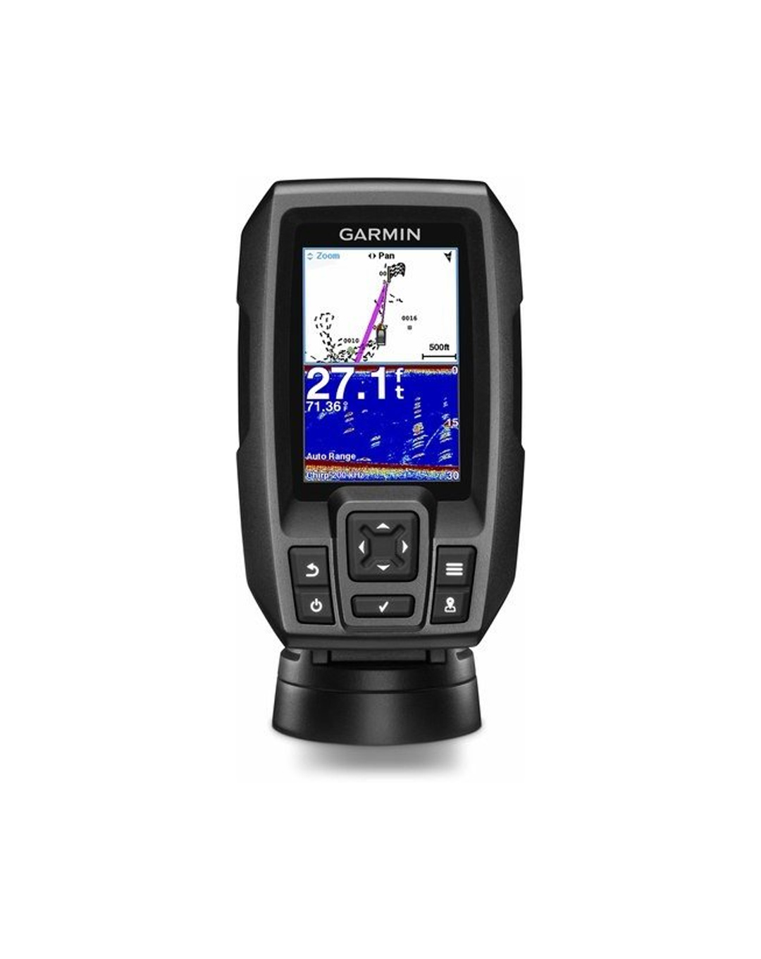 Striker 4 incluye un transductor Garmin CHIRP (77/200 kHz), el cual provee de una notable mejora en la visibilidad y claridad de los peces y estructuras en relación a transductores convencionales de 77/200 kHz.