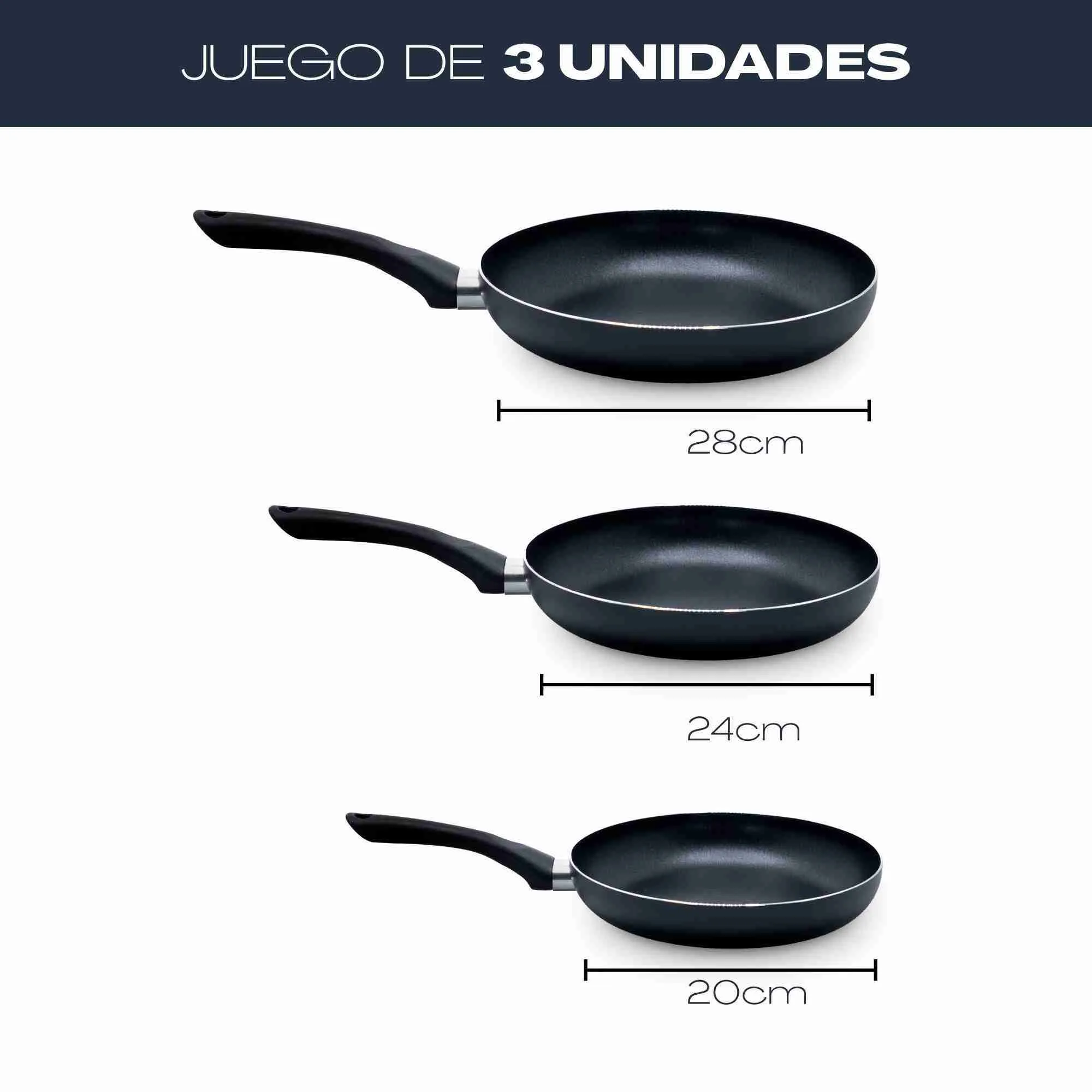 - Tres Tamaños Prácticos: Incluye sartenes de 28 cm, 24 cm y 20 cm para adaptarse a todo tipo de preparaciones, desde omelettes hasta platos completos.