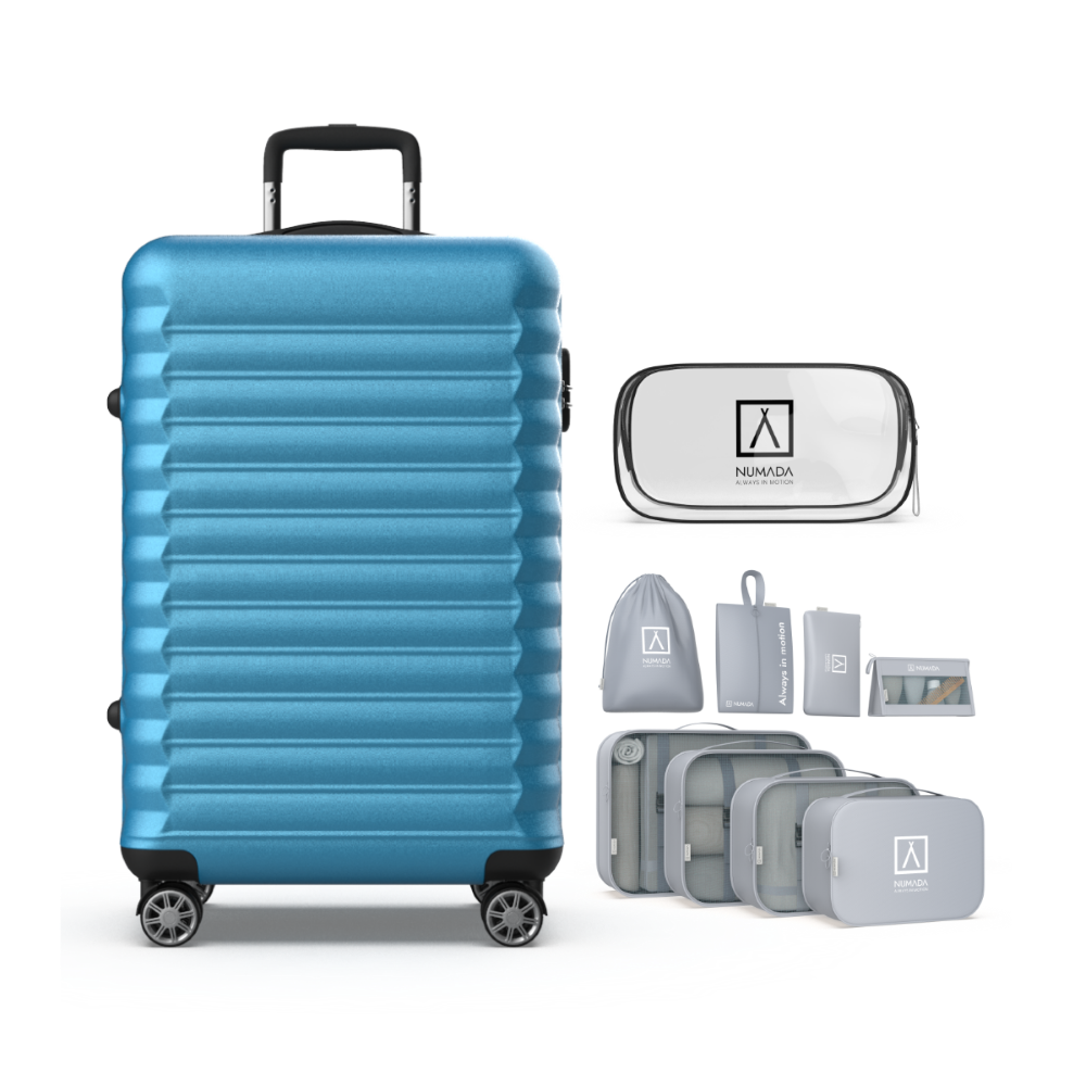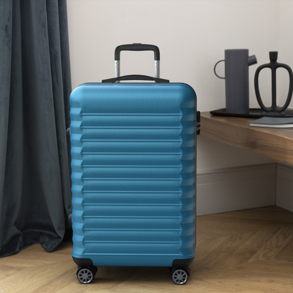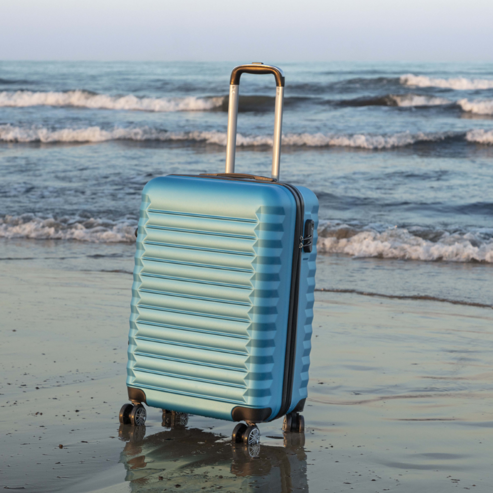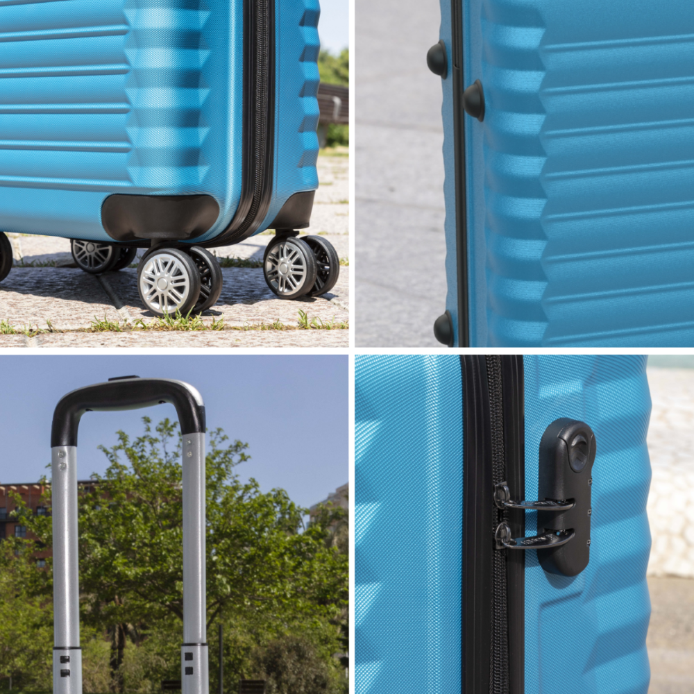 Fabricada en ABS 60% reciclado, combina ligereza y resistencia, absorbiendo impactos. Cada maleta reutiliza hasta 21 botellas de plástico de 1,5L. Sostenible y duradera.
