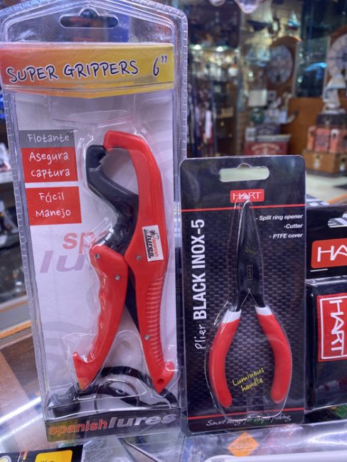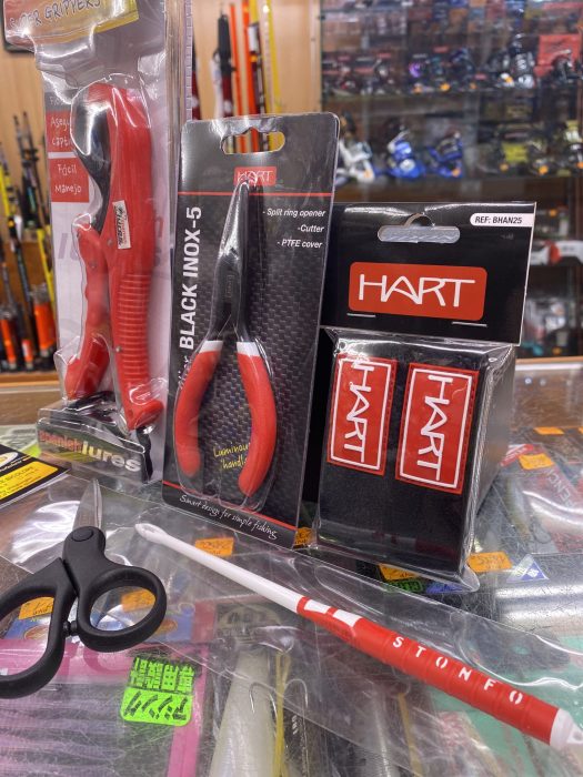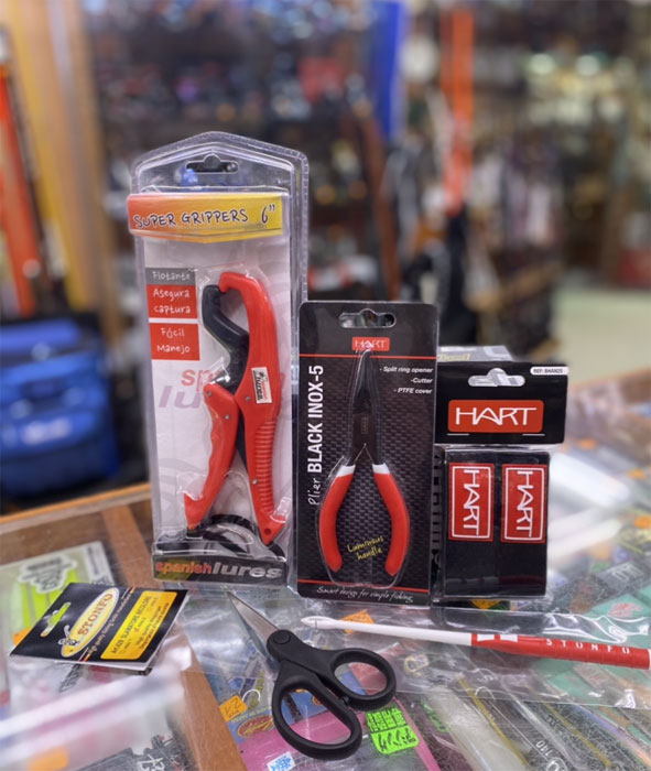 Kit de Accesorios de pesca compuesto por un Super Griper de 6´ de Spanish Lures, un alicate ( abreanillas y cortahilos) de Hart de 5´, unas Tijeras de corte Hart, un set de 2 atacañas de neopreno Hart y un desanzuelador Stonfo.