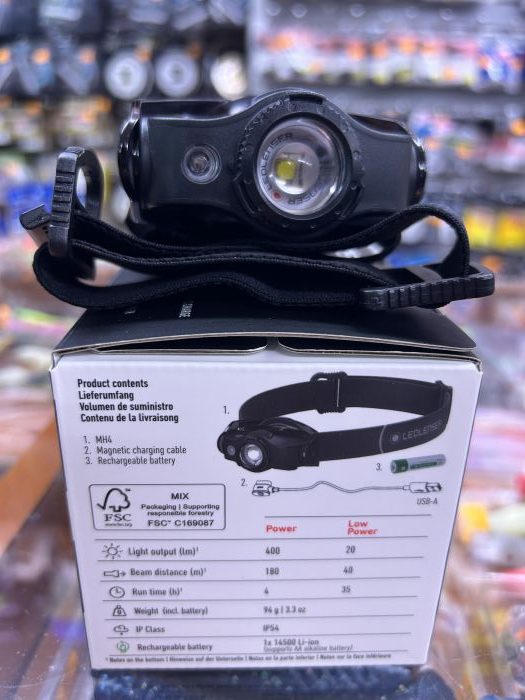 Linterna Frontal LEDLENSER MH4 recargable con 400 lumens. Para salir de pesca o de caza. Es una linterna compacta. La bateria suministrada se puede recargar comodamente con el sistema de carga magnética. Como alternativa también es posible el funcionamiento con pilas desechables de tipo AA. Gracias al cabezal extraíble de la linterna puedes transformar facilmente tu MH4 de frontal a manual.