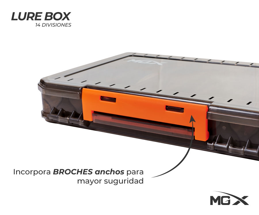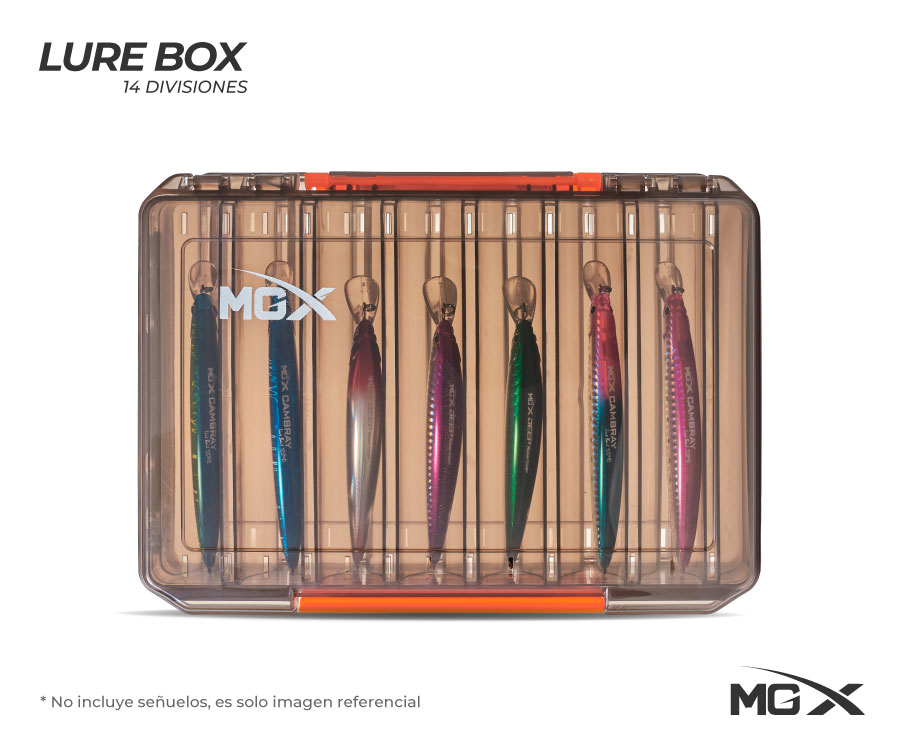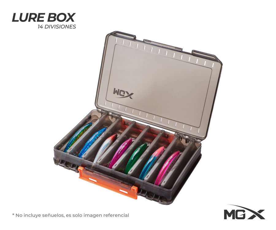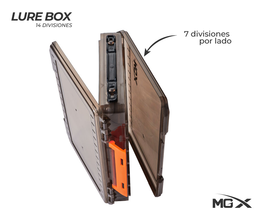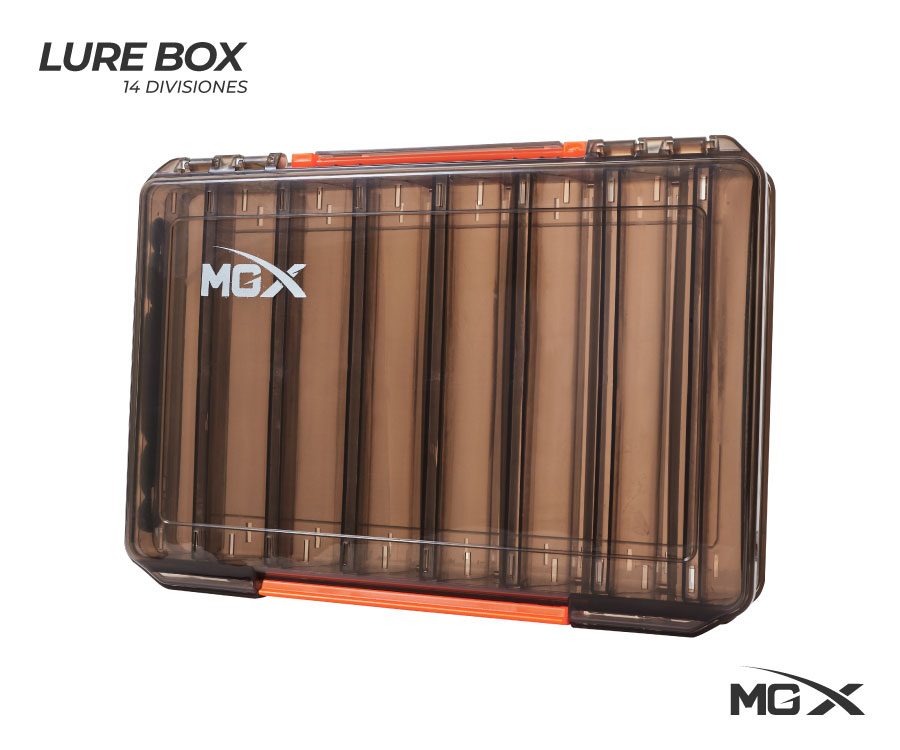 Cajas señueleras de la marca MGX, construidas en plástico muy resistente que gracias a su forma interior de acordeón permite mantener un mínimo grosor para que entre gran cantidad de señuelos de tu colección. Tiene 7 divisiones por lado haciendo un total de 14 divisiones.