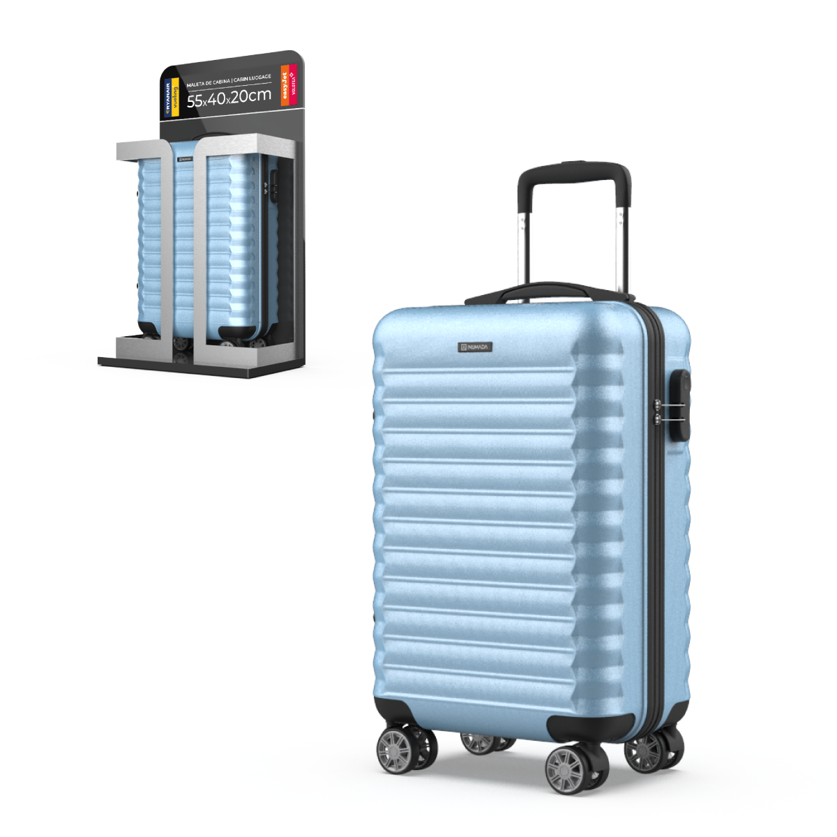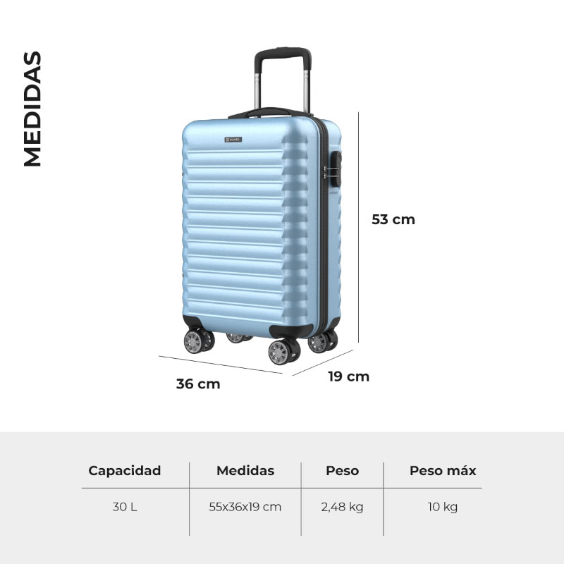 La maleta de cabina está disponible en color azul oscuro, azul claro, verde menta y negro. ¡Elige el tuyo!