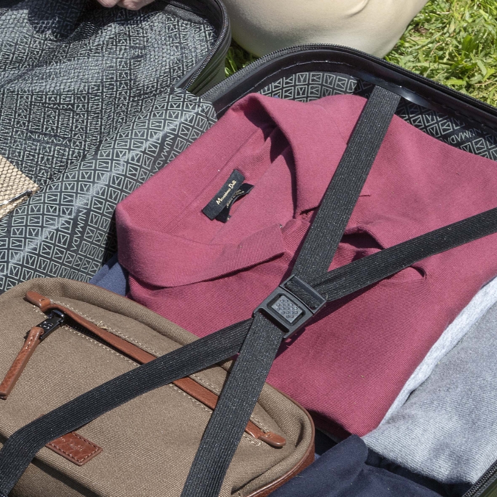 Práctico interior compartimentado con forro que incluye cintas elásticas de sujeción ajustables. Almacena una maleta de otra para ahorrar el máximo espacio.
