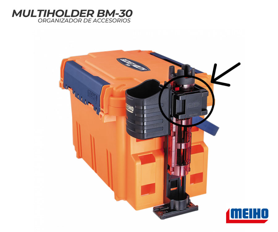El MEIHO Multiholder BM-30 es una útil herramienta que te permite adicionar más accesorios a tu tackle blox, es necesario contar antes con ROD STAND BM-300L para poder montar este accesorio.