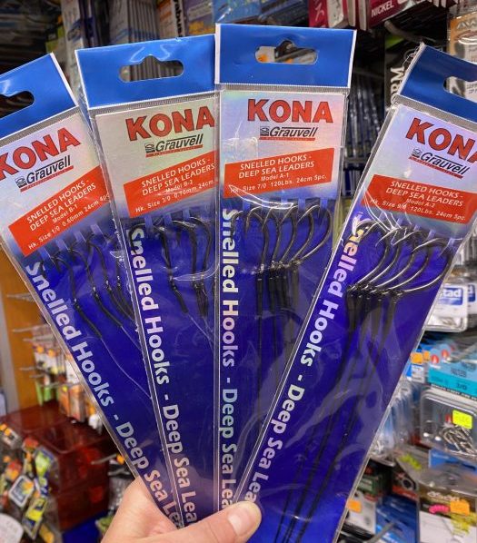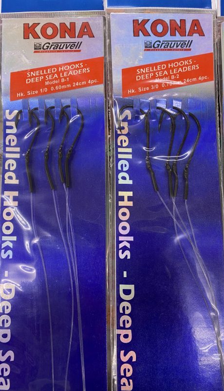 3. 1 paquete de 4 Bajos KONA GRAUVELL con nylon de 0,70 mm y anzuelo talla 3/0