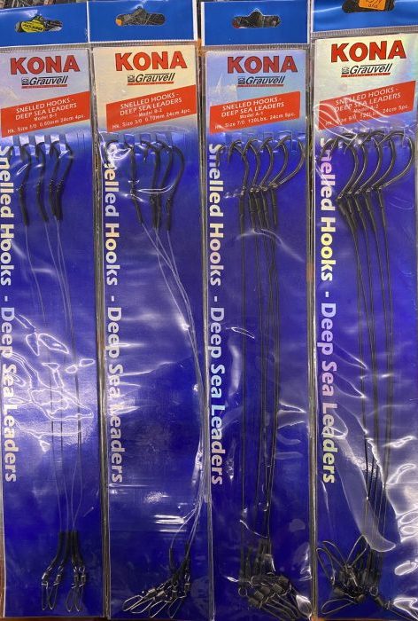 Este Pack esta compuesto por 4 paquetes de  bajos KONA de Grauvell con acero y nylon especial para la pesca de congrios y grandes peces en el mar. Un total de 18 bajos.