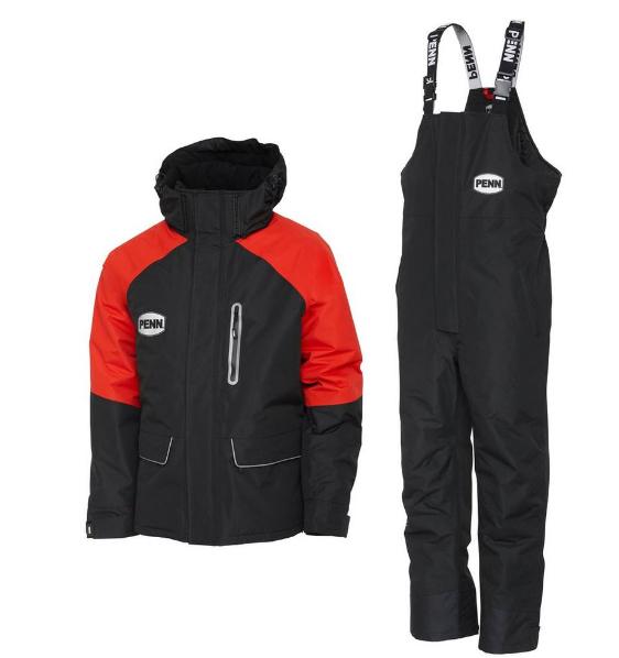 Traje de 2 piezas PENN FIERCE THERMO SUIT en talla L y color fiery/red. Traje perfecto para mantenerte abrigado en días ventosos, húmedos y fríos. Ideal para costa y embarcación.