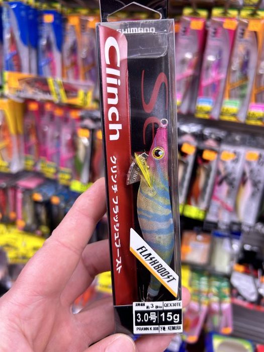Señuelo SHIMANO SEPHIA CLINCH FB 3.0 con 15 g de peso y descenso 3sec/m. Color Prawn K 008. Placa oscilante interna y emite destellos y atrae al calamar.