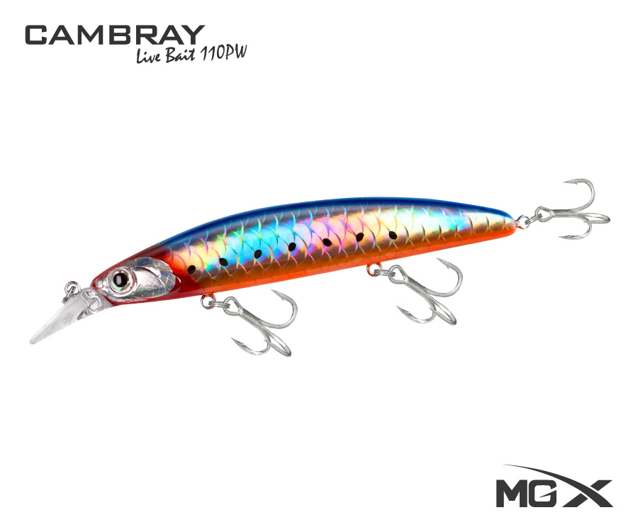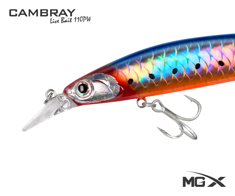 El nuevo MGX Cambray Live Bait 110PW es un señuelo especialmente diseñado para la pesca de especies depredadoras de agua salada. Tiene la apariencia de una pequeña sardina o anchoveta haciéndole honor a su nombre: “Cambray”, apelativo con el que los pescadores peruanos conocen a los juveniles de esas especies, y “Livebait” por simular casi a la perfección el nado de un pez-carnada vivo.
