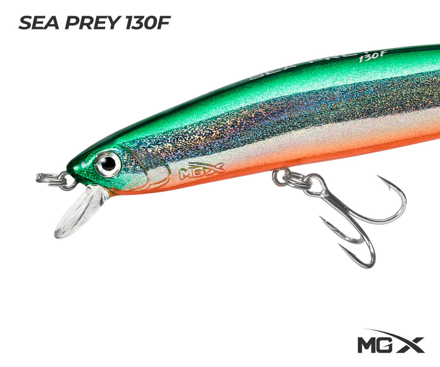 El señuelo Sea Prey 130F de MGX posee una nado muy parecido al de una anchoveta, con un wobbling y rolling bastante marcados. Equipado con un Disco Magnético que sujeta las billas para un mejor casteo; y es gracias a su forma aerodinámica y sus 130mm, que es un volador por excelencia, pudiendo alcanzar una distancia máxima de casteo de 70m aprox.