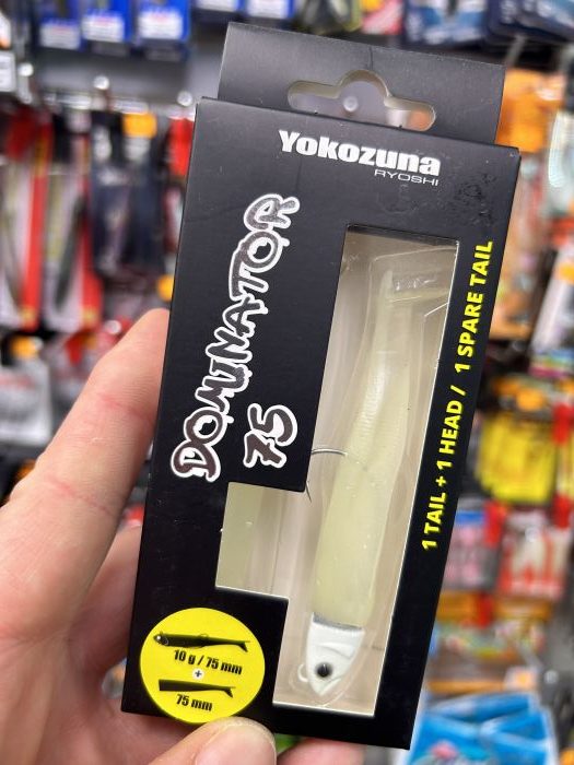 Señuelo YOKOZUNA RYOSHI DOMINATOR de 75mm y 10 gramos de peso. Cabeza plomada con cuerpo blando. Pack compuesto por un montaje completo + 1 cuerpo de repuesto. Color 07 blanco
