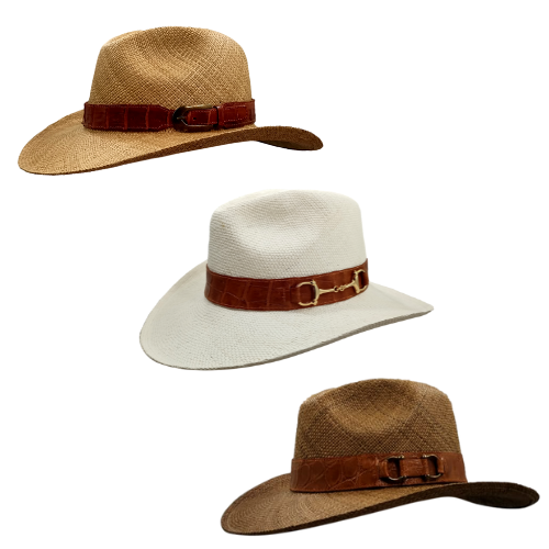 Tejido a mano con palma de toquilla en Ecuador para Dama y Caballero. Tocado en piel con diseños exclusivos.