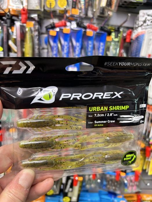 Vinilo DAIWA PROREX modelo URBAN SHRIMP de 7,2 cm en color SUMMER CRAW  con aroma a calamar. Perfecto para la pesca del spinning ligero y rockfishing. 1 Paquete de 8 unidades.