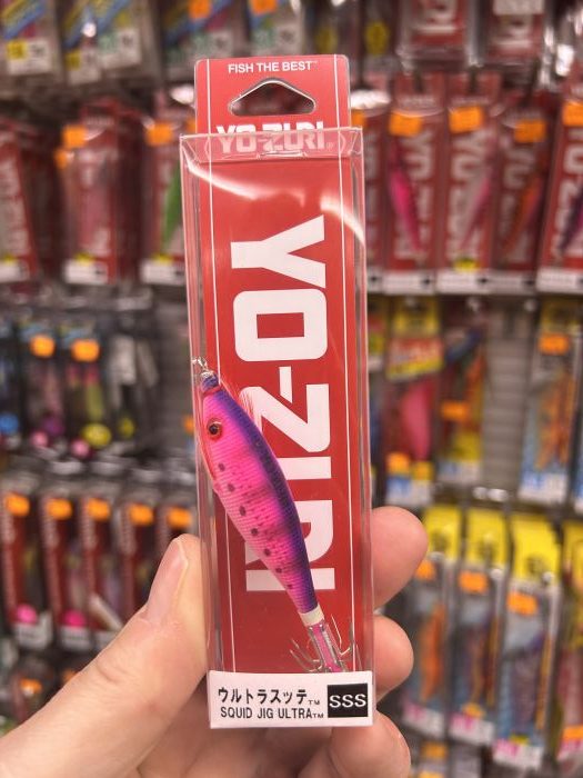 Señuelo para calamar (MODELO A1703) YO-ZURI SQUID JIG ULTRA M2 55mm (SSS) color P79 morado con tripa rosa.